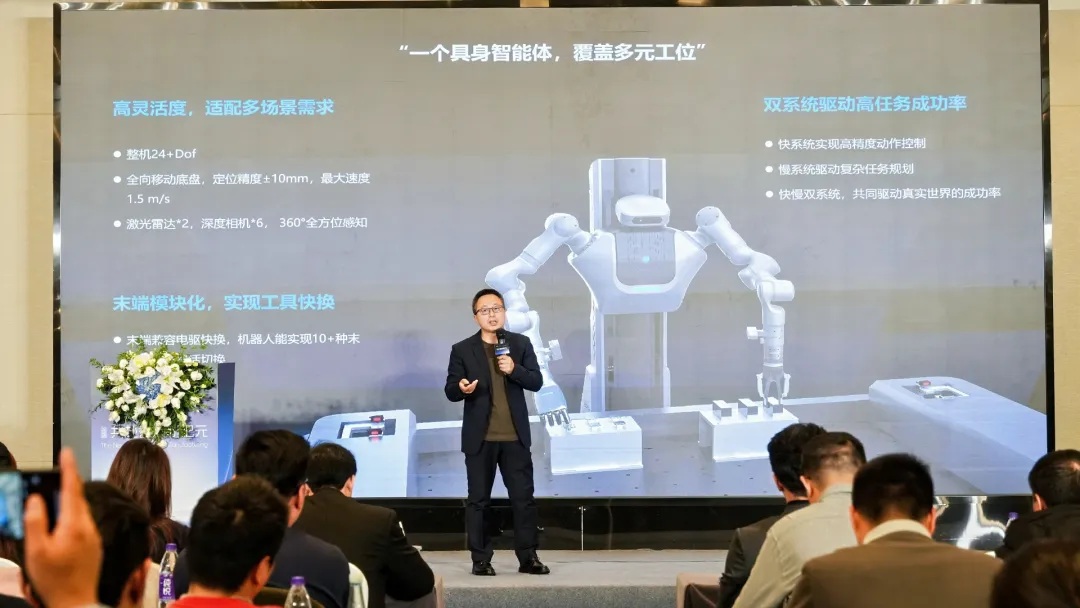 该平台融合轮式移动与仿人双臂设计,实现了从定点操作到跨工位灵活作业的全覆盖;支持工具智能快换系统,使单台机器人能胜任装配、检测、搬运等多样化任务;并通过快慢双系统协同驱动,在保障工业级高精度控制的同时,实现对复杂任务的高效规划与执行。